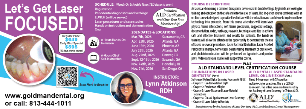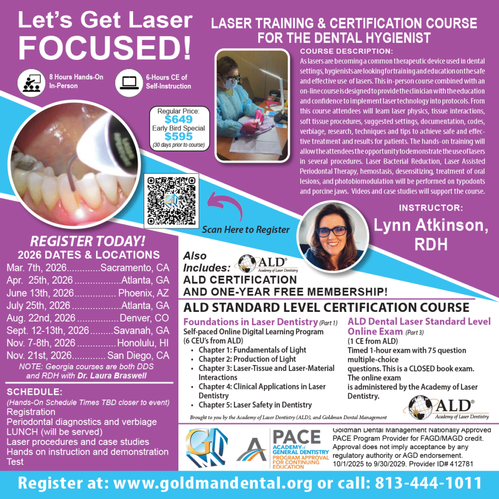 Lasers are becoming a common therapeutic device used in the dental setting, hygienists are looking for training and education on the safe and effective use of lasers This 6-hour in-person course and 2-hour online course is designed to provide the dental hygienist with the education and confidence to implement laser technology into protocols. From this course the attendees will learn laser physics, tissue interactions, soft tissue procedures, suggested settings, documentation, charting, codes, verbiage, techniques, and tips to achieve safe and effective treatment and results for patients. The hands-on portion will allow the attendees the opportunity to demonstrate the use of lasers for several procedures. Laser Bacterial Reduction, Laser Assisted Periodontal Therapy, Hemostasis, desensitizing, and treatment of oral lesions will be performed on typodonts and porcine jaws. Videos and case studies will support the course.