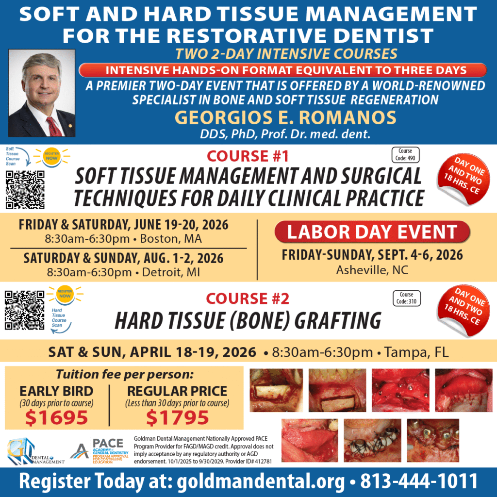 Registration fee includes continuing education credits. Payment by check, and credit cards are accepted. The fee, less a $100 per person enrollment charge will be refunded if cancellation is made more than thirty (30) days before the seminar. Cancellations received after thirty (30) days prior to the seminar will not be eligible for a refund. Make checks payable to Goldman Association Management. Register at: www.goldmandental.org or call 813-444-1011
