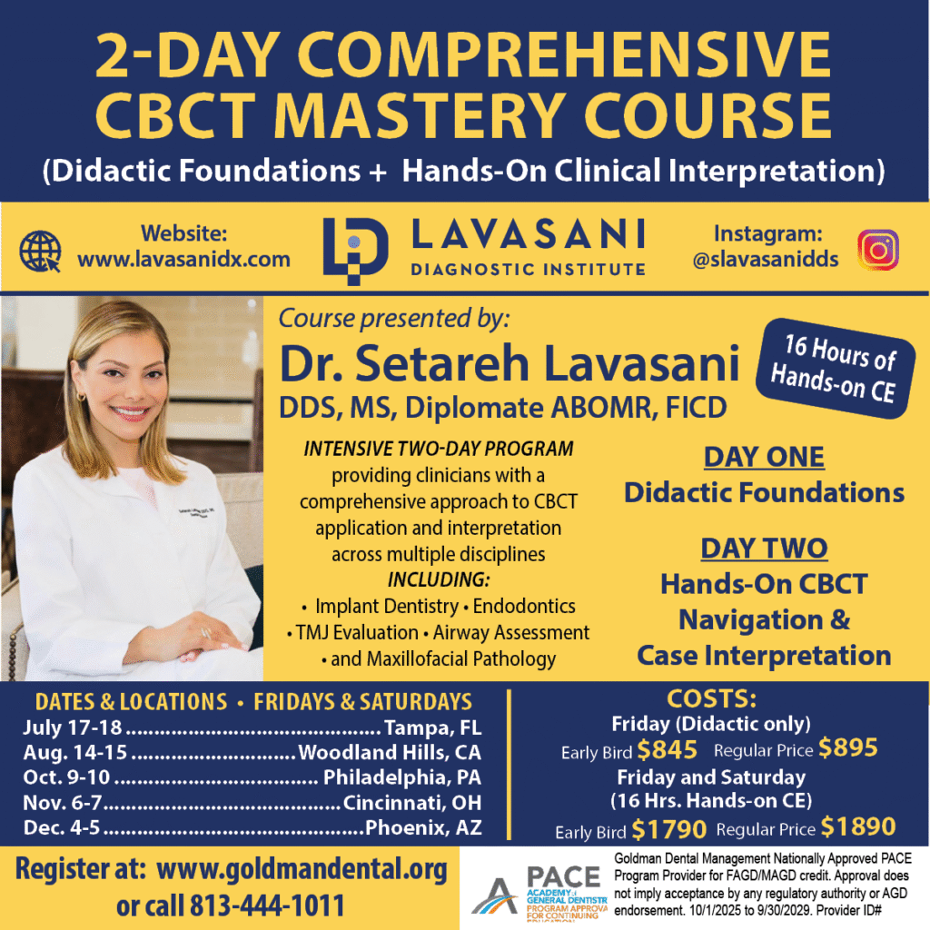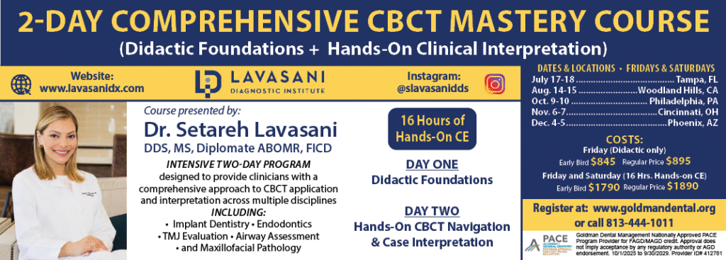 This intensive two-day program is designed to provide clinicians with a comprehensive, systematic, and clinically applicable approach to CBCT application and interpretation across multiple disciplines, including implant dentistry, endodontics, TMJ evaluation, airway assessment, and maxillofacial pathology.