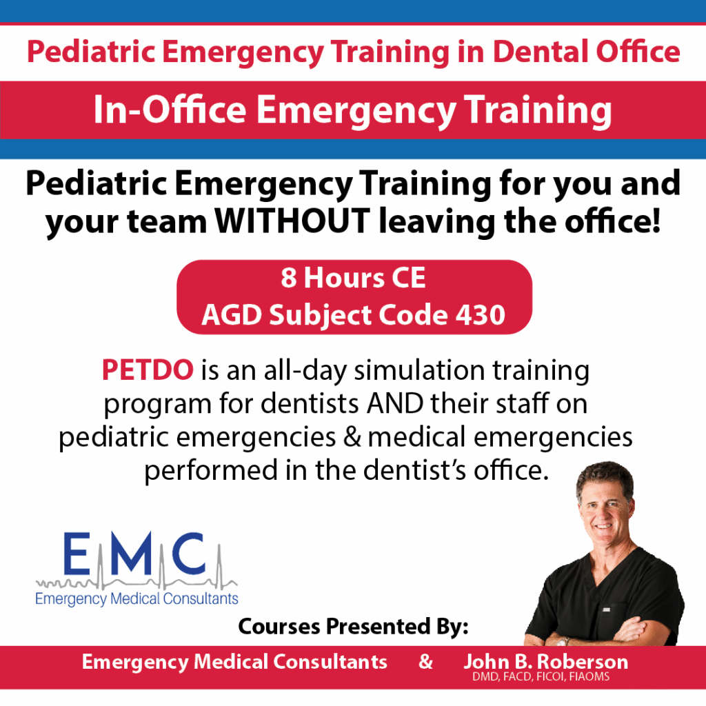 PETDO is an all-day simulation training program for dentists AND their staff on pediatric emergencies and medical emergencies performed in the dentist’s office. It is a practice of using realistic scenarios to help dental teams confidently manage various pediatric emergencies and medical emergencies.