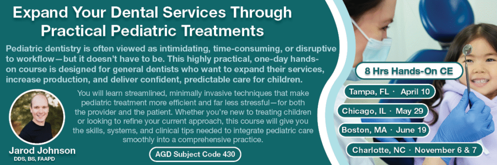 Pediatric dentistry is often viewed as intimidating, time-consuming, or disruptive to workflow—but it doesn’t have to be. This highly practical, one-day hands-on course is designed for general dentists who want to expand their services, increase production, and deliver confident, predictable care for children.