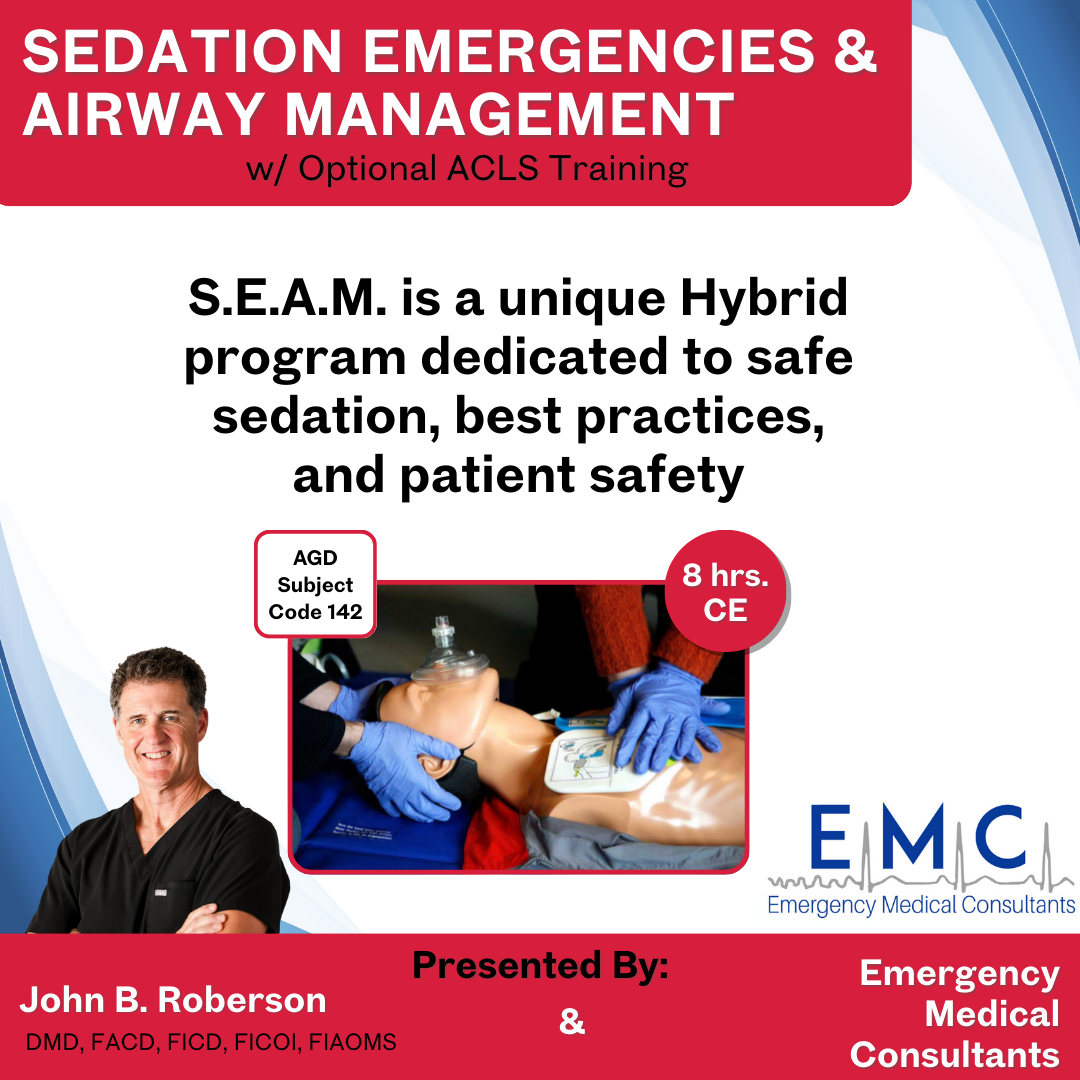 Sedation Emergencies & Airway Management (S.E.A.M.) Training program is a unique Hybrid program dedicated to the dentist/specialist and their team that does any form of sedation. Safe Sedation Best Practices and Patient Safety are our top priorities! No One Should Die in a Dental Office! SEAM consists of Three parts: