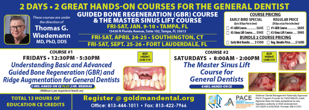 This course is under the direction of Thomas G. Wiedemann, MD, PhD, DDS, Clinical Associate Professor and full-time faculty at New York University, College of Dentistry, Department of Oral & Maxillofacial Surgery. Prof. Wiedemann´s career consists of more than 27 years of surgical and educational experience in an academic setting and successfully operating a private practice providing the full spectrum of Oral & Maxillofacial Surgery and Implant Dentistry.