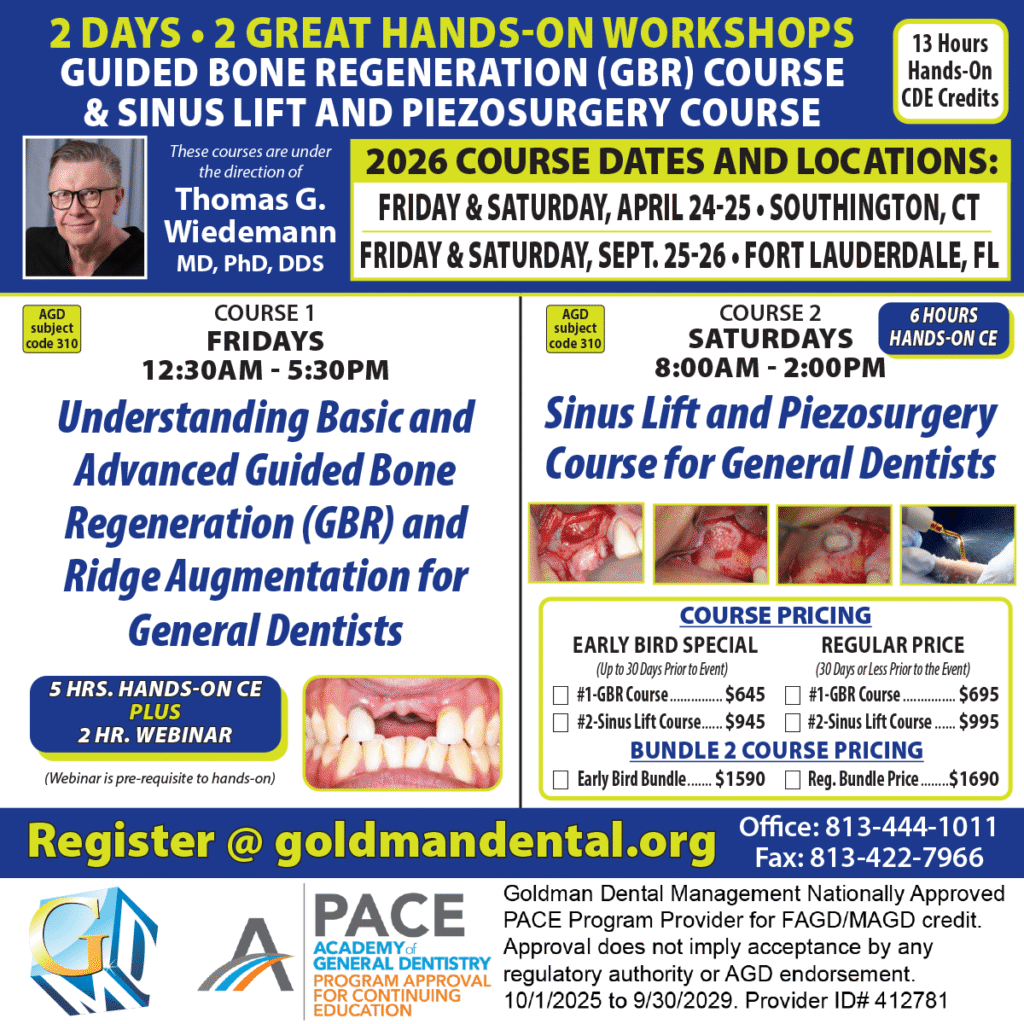 Guided Bone Regeneration and Ridge Augmentation have become routine procedures to enhance the functional, biological and aesthetic outcome of dental implants. This course will provide extensive hands-on exercises on anatomical models to prepare the general practitioner with the surgical skills necessary to perform GBR. The hands-on portion of the course will include lots of firsthand “over the shoulder” tips, tricks, and instructions. Special attention will be given to the selection of graft materials and membranes based on scientific evidence and decades of clinical experience. Participants will also perform exercises on the use of bone tacks and tenting screws.